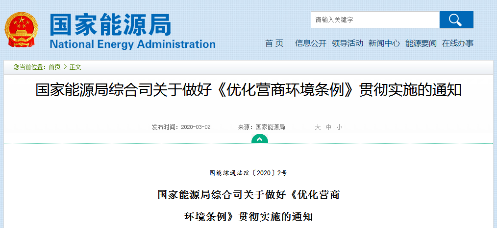 國家能源局下發(fā)關(guān)于做好《優(yōu)化營商環(huán)境條例》貫徹實施的通知